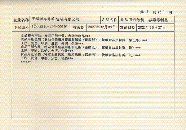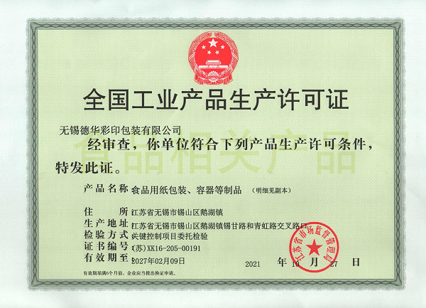 食品用纸包装生产许可证
